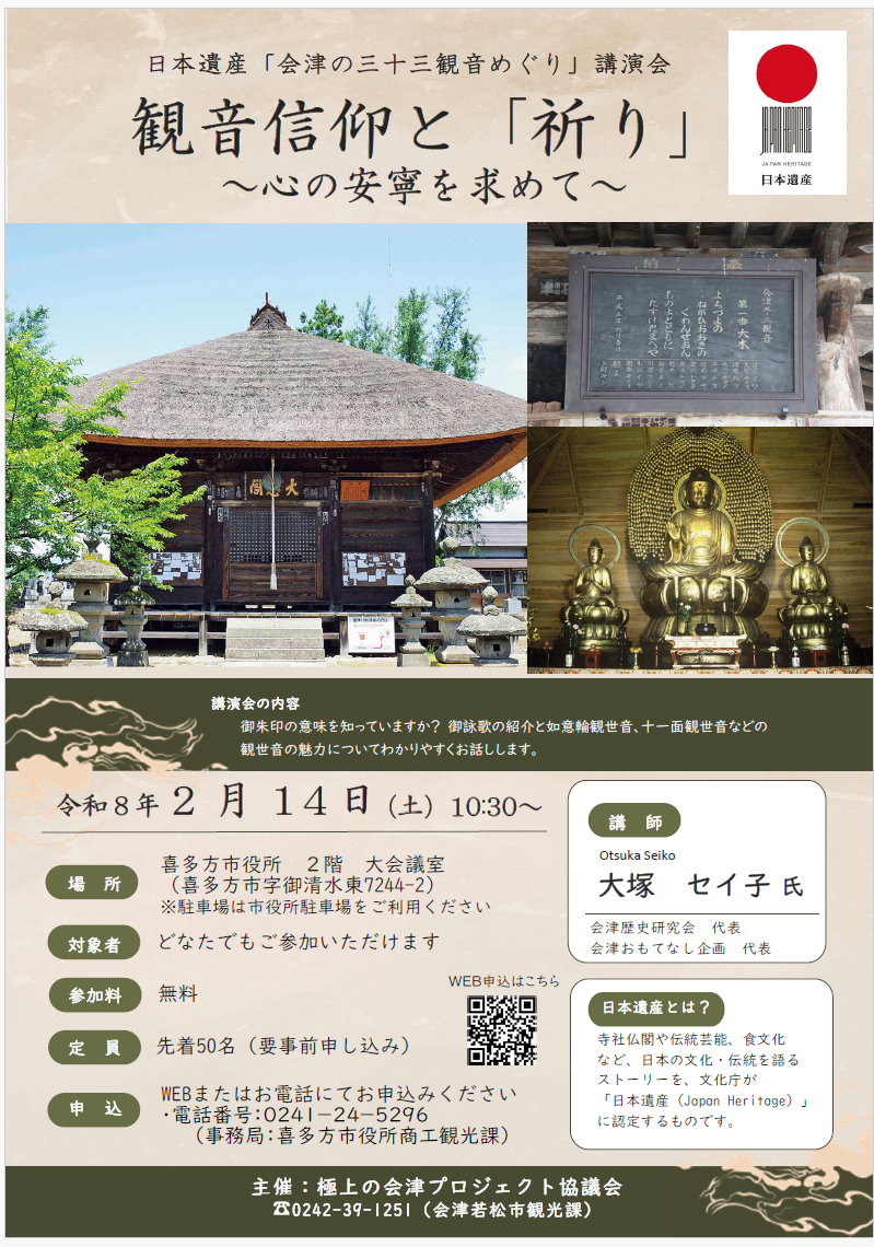 日本遺産「会津の三十三観音めぐり」の講演会を喜多方市で開催いたします。