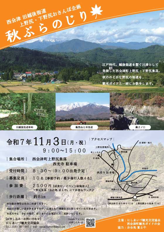 かつて会津若松と新発田を結んだ越後街道。多くの人が往来し、たくさんの宿場が栄えました。西会津町の上野尻・下野尻もその1つ。今なお残る、かつての宿場町の面影を感じながら、おさんぽ気分で歩きましょう!