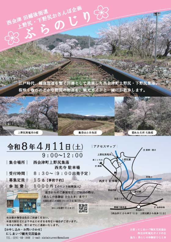 かつて会津若松と新発田を結んだ越後街道。多くの人が往来し、たくさんの宿場が栄えました。西会津町の上野尻・下野尻もその1つ。今なお残る、かつての宿場町の面影を感じながら、おさんぽ気分で歩きましょう!