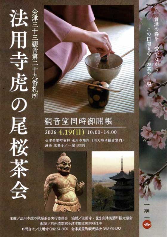 会津藩主の花見処と言われた法用寺観音堂の虎の尾桜。春の一日花見がてらにお茶を一服いかがでしょうか。観音堂同時御開帳致しますのでこの機会に是非ご参拝ください。