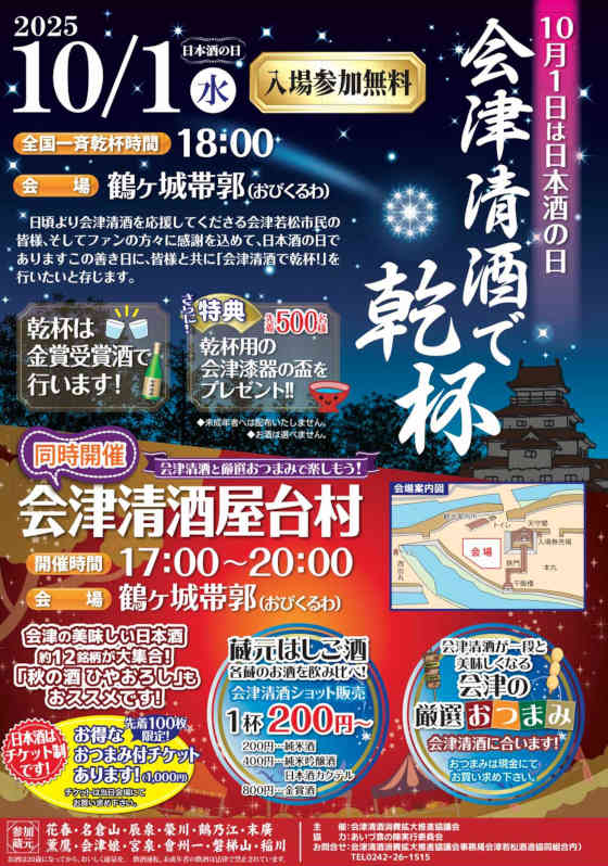 日頃より会津清酒を応援してくださる会津若松市民のみなさま、そしてファンの方々に感謝を込めて、10/1(水)の「日本酒の日」に、「会津清酒で乾杯」イベントを開催します。当日は「会津清酒屋台村」も同時開催! 当組合蔵元の選りすぐりの日本酒と厳選おつまみで、 会津の夜を楽しみましょう。 |