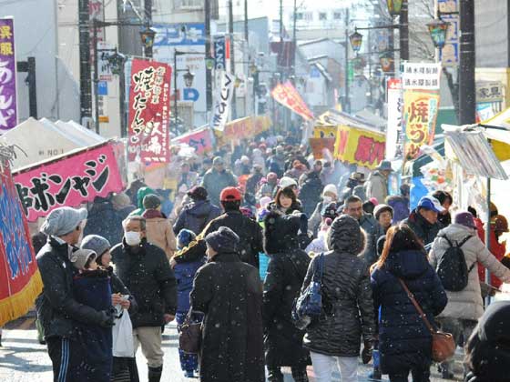 約700年の長い歴史があります。商店街は歩行者天国となり、縁起物や屋台、地域の特産品などが並び、たくさんの買い物客で賑わいます。