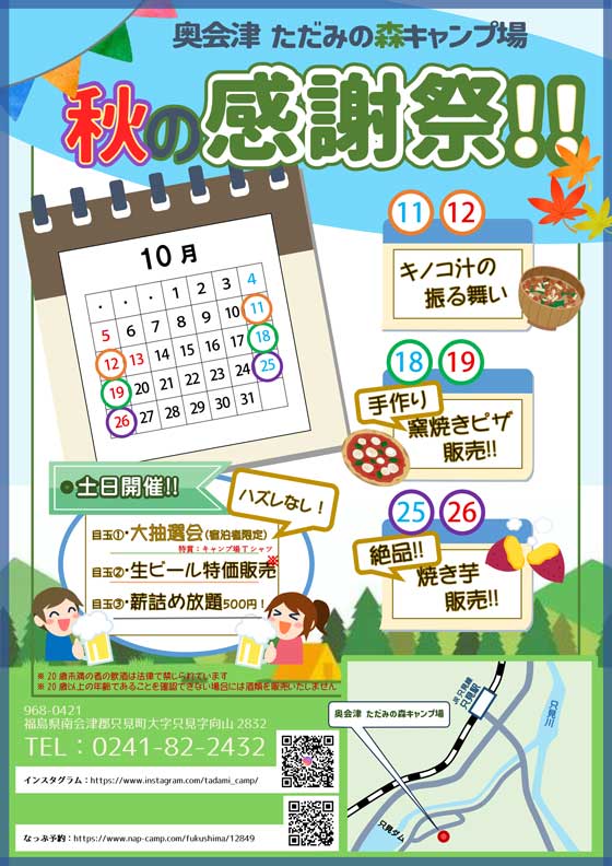10/11(土)より、10/26(日)の間の毎週土・日曜日に開催いたします。 ・大抽選会(宿泊者限定 ハズレなし) ・生ビール特価販売 ・薪詰め放題500円! また各週イベントとして、キノコ汁の振るまい、手作り 窯焼きピザ販売「絶品!! 焼き芋販売など。 |