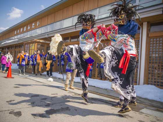 会津赤枝彼岸獅子は、春彼岸の時期に行われる伝統的な獅子舞です。磐梯町指定無形民俗文化財に指定されており、3匹の獅子に扮した若者たちが五穀豊穣を祈って各家の前で踊ります。