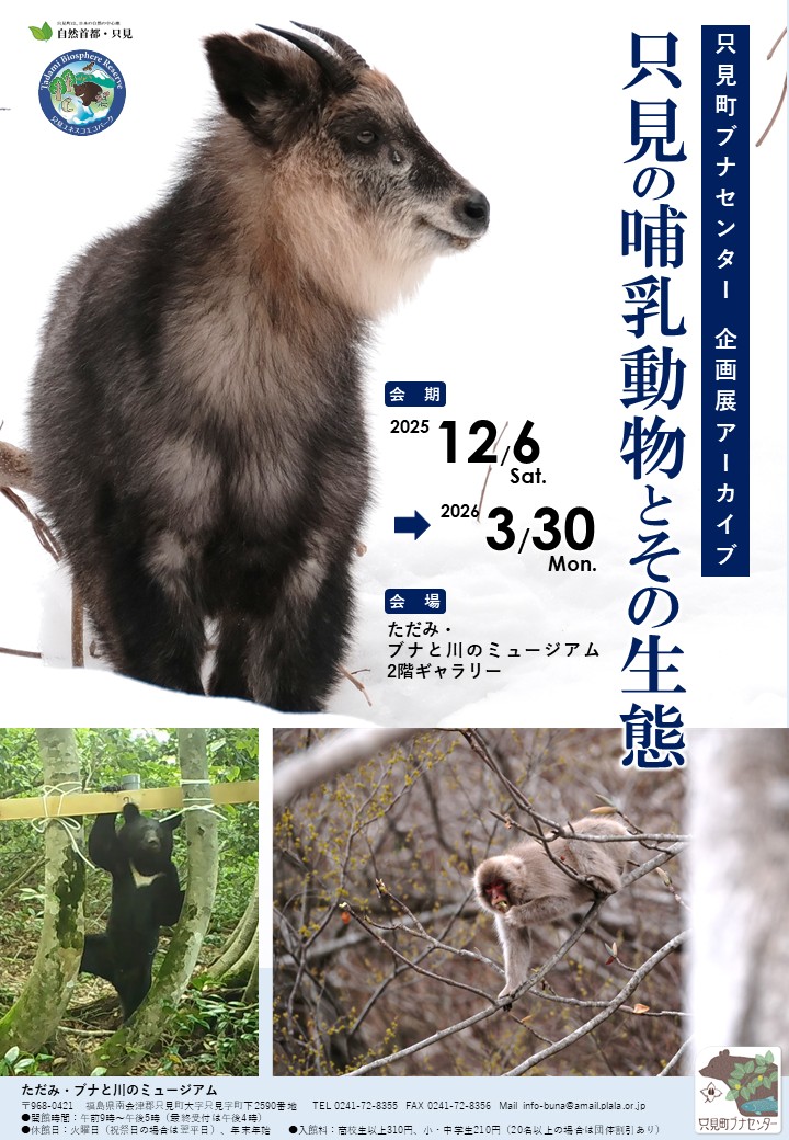 福島県只見町には、37種の哺乳動物が生息しているとされています。ただし、これらの哺乳動物の多くは夜行性ないし森林性であるため、私たち人間が目にする機会は少なく、その生態も知られていないことがあります。 本企画展では、只見町に生息する哺乳動物について、はく製とセンサーカメラで撮影した画像を交えながら、それぞれの生態的特徴を紹介します。また、狩猟文化や農林業被害などの人との関わりについても展示・解説します。 |